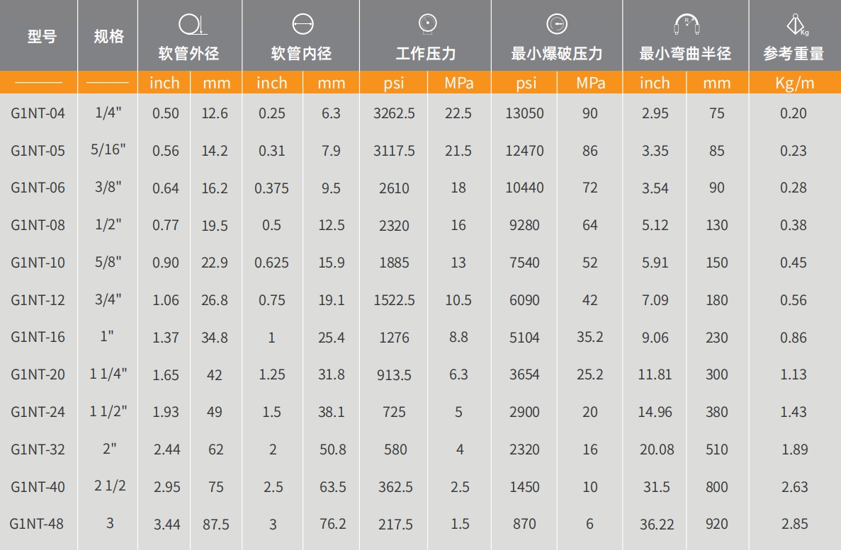 G1NT系列液压软管是一款液压工业标准橡胶软管 ,其紧凑结构可知足严酷的布管要求。G1NT液压软管为客户提供一致的性能体现以及通用性。其设计可用于普遍的流体兼容性。该系列软管使用通用一层钢丝编织结构 ,切合国际标准(ISO1436-1类型1SN) ,该系列软管具有比SAE标准划定更小的弯曲半径 ,便于布管装置。