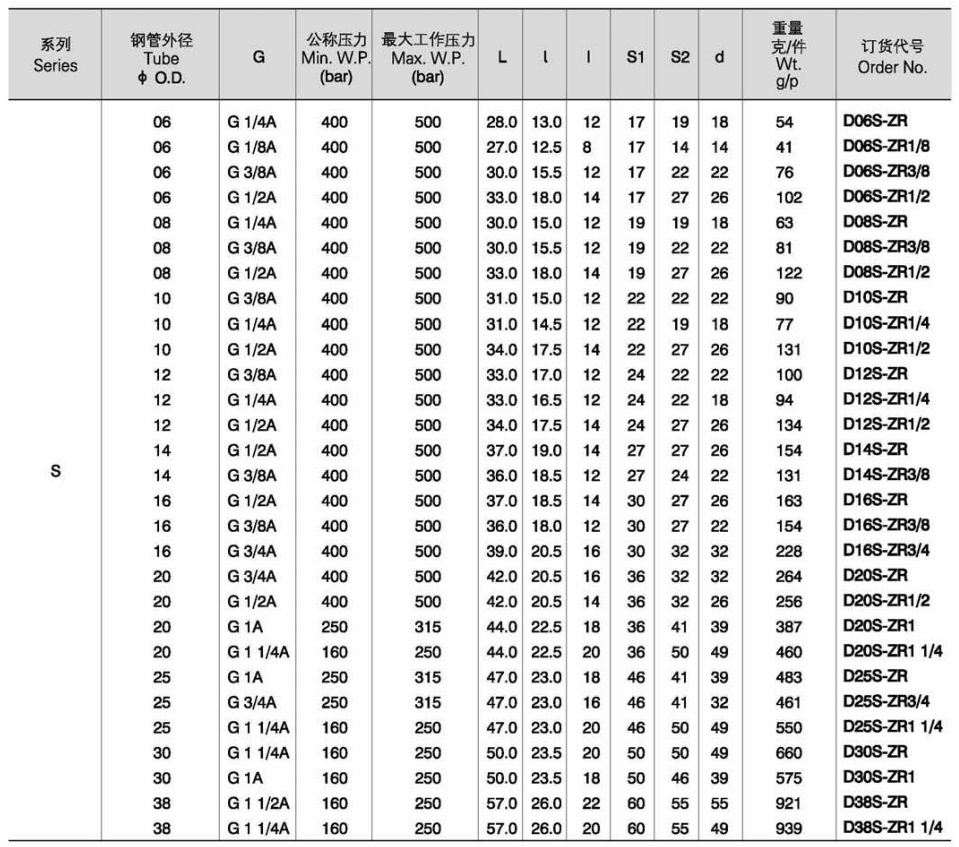 不带螺母和卡套时的订货代号示例: D10S-ZRX